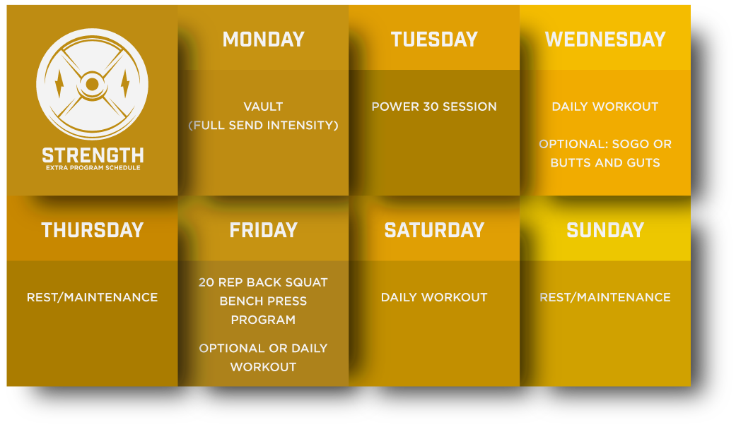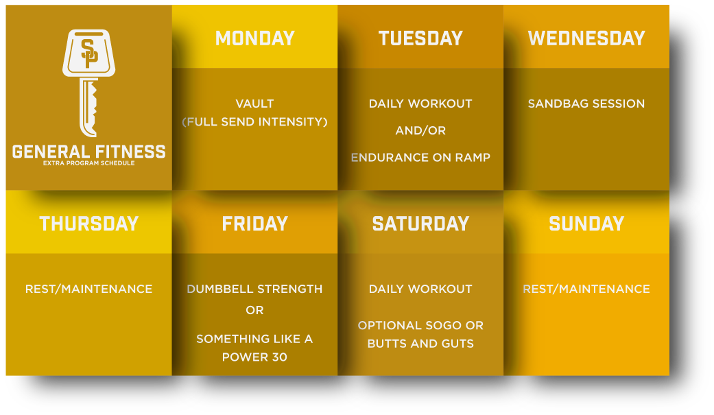 Sin embargo, programas como Bro Sessions, Power 30, Diagnostics, Starting Strength, Oly Linear, 52 Week Endurance, Sandbag Sessions, etc. son mejores para ser utilizados como reemplazo del entrenamiento principal diario, y deberán ser definitivamente el enfoque de ese día.
