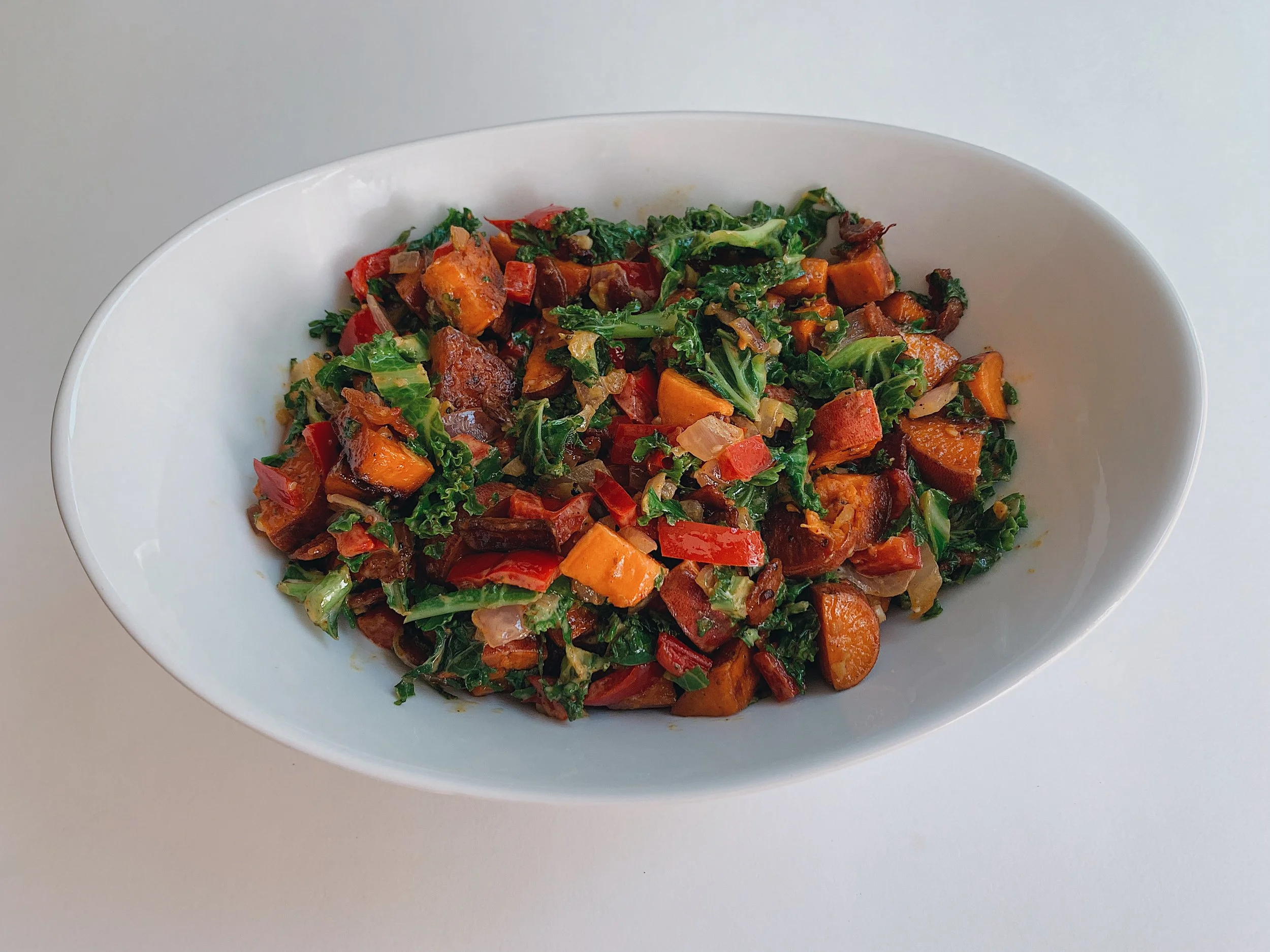 Add 1 Tbsp. of cooking fat to a large skillet on medium-high heat. Once hot, add cubed sweet potatoes. Dash with a little sea salt and black pepper. Sauté for about 10-12 minutes stirring throughout. Sweet potatoes should be cooked through. Pro tip: Cover the skillet to help speed up the cooking process!