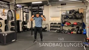 For the lunges clean and jerk the sandbag onto your back rack so it's on your shoulders with your hands holding it on both sides.